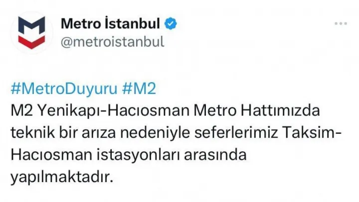 Metroİstanbul'dan yapılan açıklamada ise, 'M2 Yenikapı-Hacıosman Metro Hattımızda teknik bir arıza nedeniyle seferlerimiz Taksim-Hacıosman istasyonları arasında yapılmaktadır' denildi.