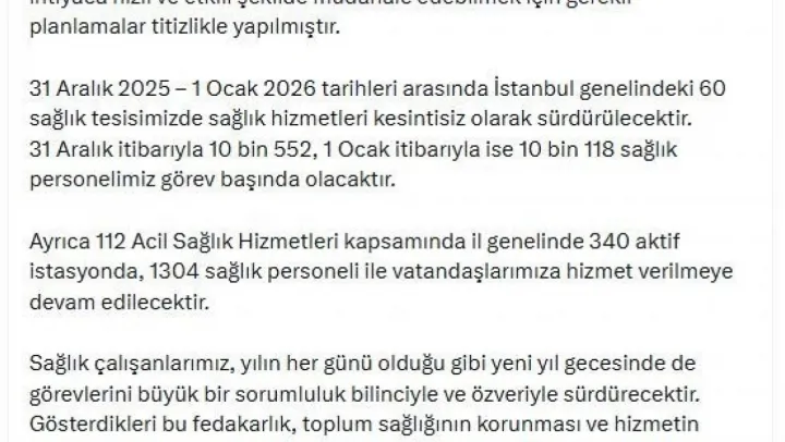 İstanbul İl Sağlık Müdürü Doç. Dr. Abdullah Emre Güner, sosyal medya hesabından yılbaşına ilişkin yaptığı açıklamada, Tüm hazırlıklarımızı tamamladık, 31 Aralık 2025-1 Ocak 2026 tarihleri arasında İstanbul genelindeki 60 sağlık tesisimizde sağlık hizmetleri kesintisiz olarak sürdürülecektir. 31 Aralık itibarıyla 10 bin 552, 1 Ocak itibarıyla ise 10 bin 118 sağlık personelimiz görev başında olacaktır dedi.