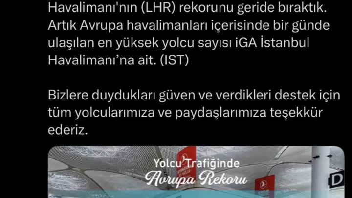İstanbul Havalimanı'nın ulaştığı bu başarı, İGA'nın sosyal medya hesabından paylaşıldı. X platformundan yapılan paylaşımda, '25 Temmuz 2025 tarihinde, bir günde toplam 271 bin 836 yolcuya hizmet vererek Avrupa'nın günlük yolcu rekorunu kırdık! Bu başarıyla birlikte, daha önce 30 Haziran 2024 tarihinde 268 bin yolcuyla bu alandaki liderliği elinde bulunduran Londra Heathrow Havalimanı'nın (LHR) rekorunu geride bıraktık. Artık Avrupa havalimanları içerisinde bir günde ulaşılan en yüksek yolcu sayısı iGA İstanbul Havalimanı'na ait. (IST) Bizlere duydukları güven ve verdikleri destek için tüm yolcularımıza ve paydaşlarımıza teşekkür ederiz' ifadelerine yer verildi.