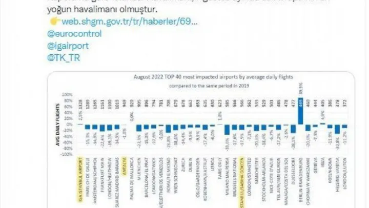 İstanbul Havalimanı'nı bin 289 uçula Paris Charles de Gaulle Havalimanı ikinci sırada takip ederken, Amsterdam Schiphol Havalimanı ise ortalama bin 265 uçuşla üçüncü sırada yer aldı. Türkiye'nin en önemli turizm destinasyonu konumundaki Antalya Havalimanı da belirtilen dönemde günlük ortalama 949 uçuş ile 7'nci sırada yer aldı.