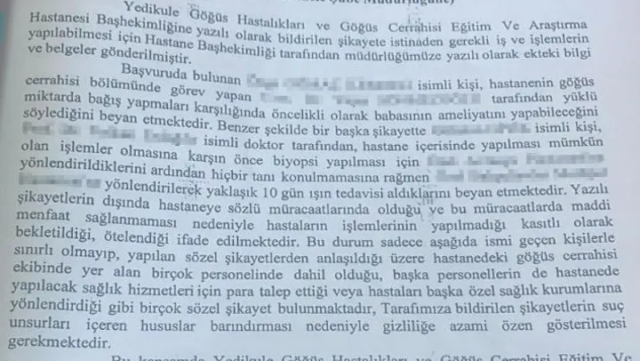 Şüphelilere yönelik çeşitli takipler yapılırken İstanbul İl Sağlık Müdürlüğü'nden konuya ilişkin yapılan açıklamada, '15 Mayıs 2024 tarihinde Yedikule Göğüs Hastalıkları ve Göğüs Cerrahisi Eğitim ve Araştırma Hastanesi Başhekimliğine yazılı olarak bildirilen şikayet; 27 Mayıs 2024 tarihinde İl Sağlık Müdürlüğümüzce, İstanbul İl Emniyet Müdürlüğü'ne bildirilmiş olup konu hakkında inceleme başlatılmıştır. Hastanenin göğüs cerrahi biriminde görevli olan personeller hakkında, hasta ve hasta yakınları tarafından farklı tarihlerde yapılan; ilgili personellerin hastane içinde veya dış merkezde ameliyat yapmak ve patolojik materyallerin hastane dışına gönderilmesi konularında para ve menfaat talebinde bulundukları, maddi menfaat sağlayan hasta ve hasta yakınlarının ameliyat ve patolojik materyal temini işlemlerinin yapıldığı, maddi menfaat sağlamaktan kaçınan hasta ve hasta yakınlarının ise başvurularının kasıtlı olarak bekletildiği ve ameliyat, biyopsi işlemlerinin yapılmadığı yönünde şikayetler saptanmıştır' ifadeleri yer aldı.