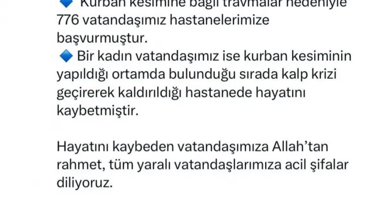 İstanbul İl Sağlık Müdürü Doç. Dr. Abdullah Emre Güner, sosyal medya hesabından yaptığı açıklamada, 'Bugün İstanbul'da trafik kazaları nedeniyle 53 vatandaşımız, kurban kesimine bağlı travmalar nedeniyle 776 vatandaşımız hastanelerimize başvurmuştur. Bir kadın vatandaşımız ise kurban kesiminin yapıldığı ortamda bulunduğu sırada kalp krizi geçirerek kaldırıldığı hastanede hayatını kaybetmiştir. Hayatını kaybeden vatandaşımıza Allah'tan rahmet, tüm yaralı vatandaşlarımıza acil şifalar diliyoruz. Kurban kesiminin ehil kişilerce, uygun ve güvenli ortamlarda yapılması hayati önemdedir. Lütfen hem kendi sağlığınızı hem çevrenizdekilerin güvenliğini riske atmayın' ifadelerini kullandı.