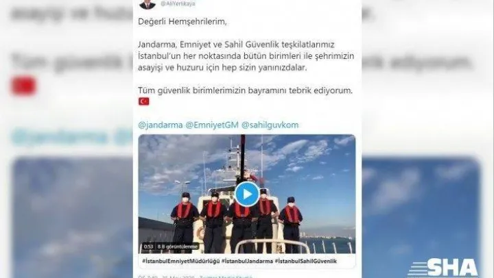 İSTANBUL VALİSİ ALİ YERLİKAYA, SOSYAL MEDYA HESABI ÜZERİNDEN TÜM GÜVENLİK BİRİMLERİNİN BAYRAMINI TEBRİK ETTİ. GÜVENLİK BİRİMLERİNİN HERKESİN BAYRAMINI KUTLADIĞI BİR VİDEO PAYLAŞAN YERLİKAYA, "JANDARMA, EMNİYET VE SAHİL GÜVENLİK TEŞKİLATLARIMIZ İSTANBUL'UN HER NOKTASINDA BÜTÜN BİRİMLERİ İLE ŞEHRİMİZİN ASAYİŞİ VE HUZURU İÇİN HEP SİZİN YANINIZDALAR" İFADELERİNİ KULLANDI.