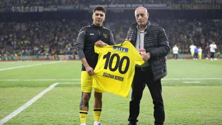 İstanbulsporlu futbolcu Oğuzhan Berber'e, Fenerbahçe maçı öncesinde sarı-siyahlı forma ile 100. maçına çıktığı için plaket verildi.