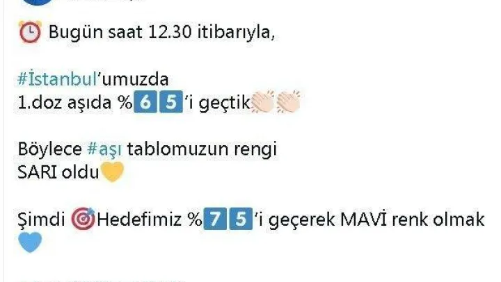 İstanbul Valisi Ali Yerlikaya, sosyal medya hesabından, 'İstanbul'umuzda 1.doz aşıda yüzde 65'i geçtik. Böylece aşı tablomuzun rengi SARI oldu. Şimdi Hedefimiz yüzde 75'i ge geçerek mavi renk olmak' ifadelerini kullandı.
