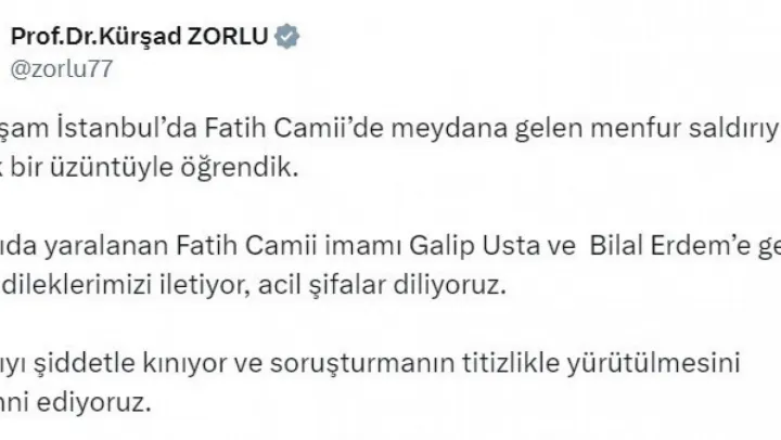 İYİ Parti Sözcüsü Kürşad Zorlu, Fatih Camii'nde imama ve bir vatandaşa yapılan saldırıyı kınayarak, 'Fatih Camii imamı Galip Usta ve Bilal Erdem'e geçmiş olsun dileklerimizi iletiyoruz' dedi.