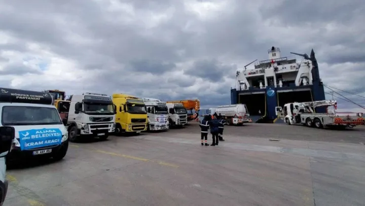 Ulaştırma ve Altyapı Bakanlığı koordinesinde Çeşme Limanından kalkacak ro ro gemiye, İzmir'in tüm ilçelerinden gelen çok sayıda iş makinası, yaşam konteyneri, beton delici, forklift, vinç, gıda, sağlık ve yaşam malzemeleri ve su gibi deprem bölgesinde gerekli olacak malzemeleri yükleniyor.