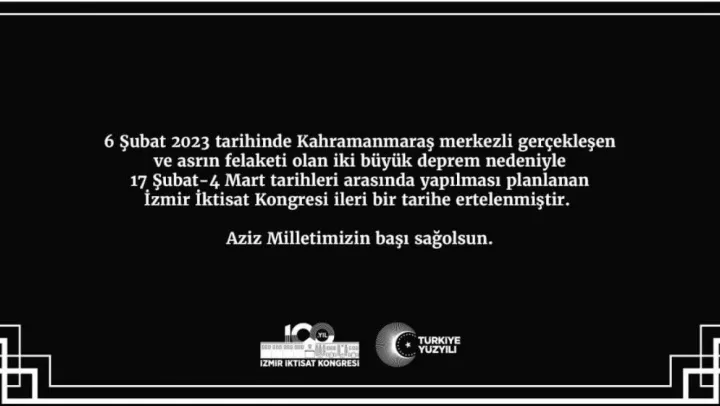 İzmir İktisat Kongresi sosyal medya hesabından yapılan açıklamada, '6 Şubat 2023 tarihinde Kahramanmaraş merkezli gerçekleşen ve asrın felaketi olan iki büyük deprem nedeniyle 17 Şubat-4 Mart tarihleri arasında yapılması planlanan İzmir İktisat Kongresi ileri bir tarihe ertelenmiştir. Aziz milletimizin başı sağ olsun' ifadelerine yer verildi.