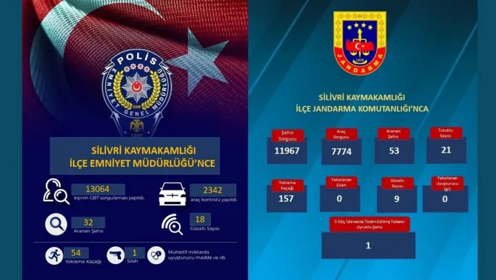 Silivri İlçe Emniyet Müdürlüğü ekipleri ise 13.064 kişinin GBT sorgulamasını gerçekleştirdi, 2.342 araç kontrol etti. Denetimlerde 32 aranan şahıs yakalanırken, 18 şahıs gözaltına alındı. 1 ruhsatsız silah ve muhtelif miktarda uyuşturucu madde ele geçirildi. Ayrıca 54 yoklama kaçağı tespit edildi.