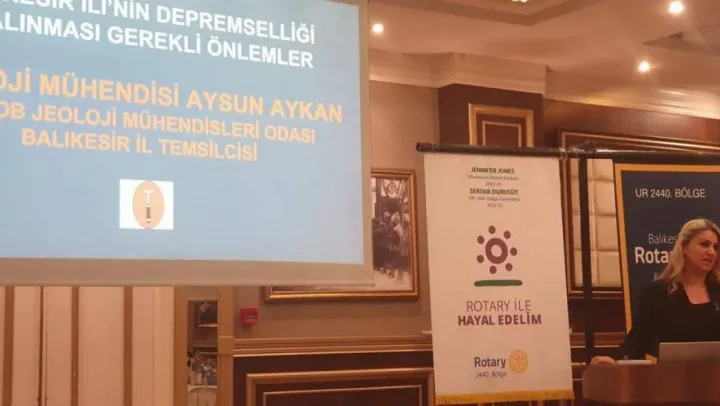 Jeoloji Mühendisleri Odası Balıkesir İl Temsilcisi Aysun Aykan, birçok kentimizi etkileyen Mw=7,7 ve Mw=7,6 büyüklüğündeki deprem ile Türkiye'de çok büyük afet yaşanan depremi değerlendirdi. Konferansta Türkiye'nin dünyanın en aktif tektonik kuşaklarının üzerinde olduğu, bu yüzden deprem tehlikesi ve riski altında olduğuna dikkat çeken Aysun Aykan, Türkiye'de deprem bilincinin oluşturulması gerektiğini ifade etti.