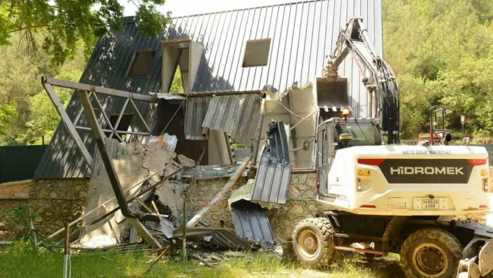 Zabıta ekiplerinin güvenlik önlemleri eşliğinde gerçekleştirilen yıkım çalışmasında, bin 900 metrekarelik arazi üzerine kurulu toplam 270 metrekarelik iki kaçak villa ile birlikte alandaki müştemilat da kullanılamaz hale getirildi.
