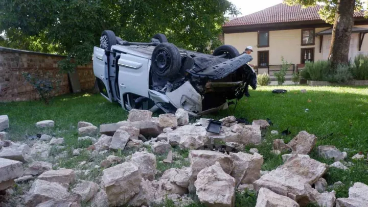 Edirne'de polisin dur ihtarına uymayan göçmen kaçakçısı şüphelinin kullandığı panelvan camii bahçesine uçtu. Ağır hasar oluşan araç, vinç yardımıyla otoparka kaldırıldı.