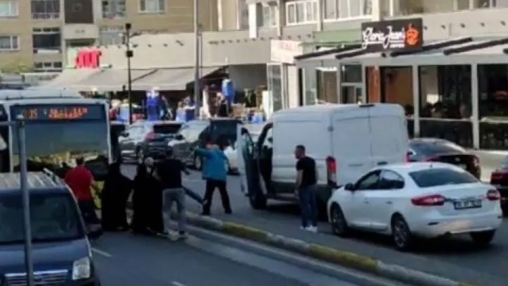 Küçükçekmece'de, panelvan araç sürücüsü ile yolun karşısına geçen kadın arasında tartışma çıktı. Kadının kocası sürücünün kafasına sopayla vurarak yaraladı. O anlar kameraya yansıdı.