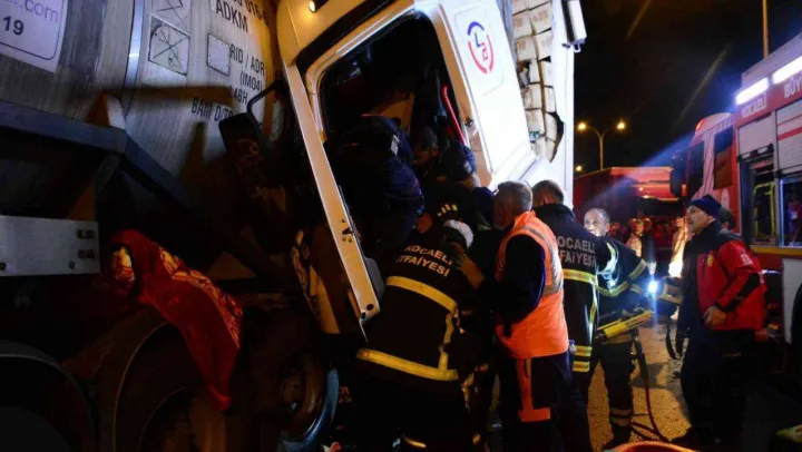 TEM Otoyolu Kocaeli geçişinde tankere arkadan çarpan gofret yüklü tır, kağıt gibi ezildi. İçinde sıkışan sürücü yaklaşık 1 saatlik çalışmayla itfaiye ekipleri tarafından kurtarılırken yol uzun bir süre trafiğe kapandı.