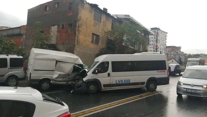Okmeydanı'nda hız ve hatalı sollama yaptığı iddia edilen servis minibüsü, virajı dönerken panalvan tipi araçla kafa kafaya çarpıştı. Yağmurun da neden olduğu kazada servis minibüsünde bulunan 7 kişiyle ve diğer aracın sürücüsü yaralandı. Kaza nedeniyle yol trafiğe kapanırken, yaralılar hastaneye kaldırıldı. Servis minibüsünün kaydığı anlar ise güvenlik kamerasına yansıdı.