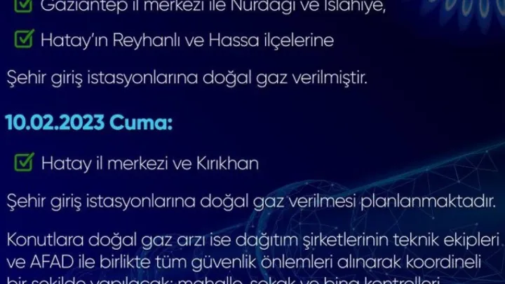 BOTAŞ sosyal medya hesabından deprem bölgelerine doğalgaz verilmesine ilişkin bilgileri paylaştı. Paylaşılan bilgilere göre, Kahramanmaraş il merkezi ile Pazarcık ve Narlı ilçesine, Gaziantep il merkezi ile Nurdağı ve Islahiye ilçesine, Hatay'ın Reyhanlı ve Hassa ilçelerine şehir giriş istasyonlarına doğalgaz verilmeye başlandı. Hatay il merkezi ve Kırıkhan ilçesine ise yarın şehir giriş istasyonlarına doğalgaz verilmesi planlanıyor. Paylaşılan bilgide konutlara doğalgaz arzının ise dağıtım şirketlerinin teknik ekipleri ve AFAD ile birlikte tüm güvenlik önlemleri alınarak koordineli bir şekilde yapılacağı ve mahalle, sokak ve bina kontrolleri sonrasında doğalgaz dağıtımı sağlanacağı belirtildi.