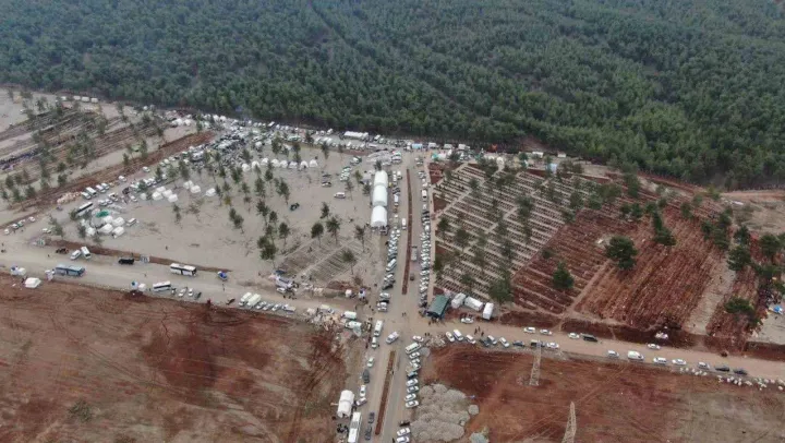 Depremde hayatını kaybeden ve Kahramanmaraş şehir merkezindeki Kapıçam Mezarlığı'nda defnedilenlerin sayısı 5 bine ulaşırken, yaşanan yoğunluk ve çalışmalar İHA dronu tarafından görüntülendi. Mezardaki işlemler koordinasyon halinde seri bir şekilde gerçekleştiriliyor. Cenaze araçların biri gidip birisi geliyor.
