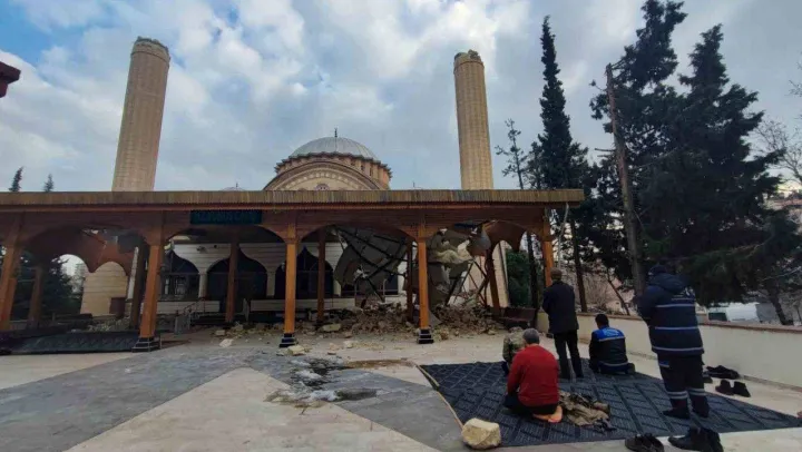 Kahramanmaraş'ta meydana gelen depremlerde vatandaşlar büyük çapta hasar gören caminin avlusunda namaz ibadetlerini gerçekleştiriyor.