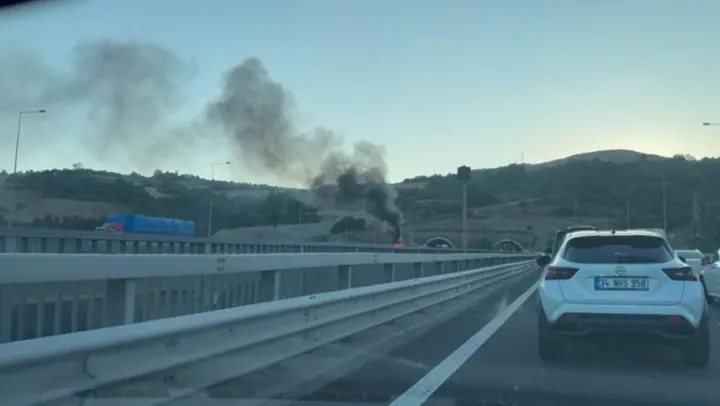 Kuzey Marmara Otoyolu Körfez geçişinde kamyon alev aldı. Trafikte uzun kuyruklar oluştu.