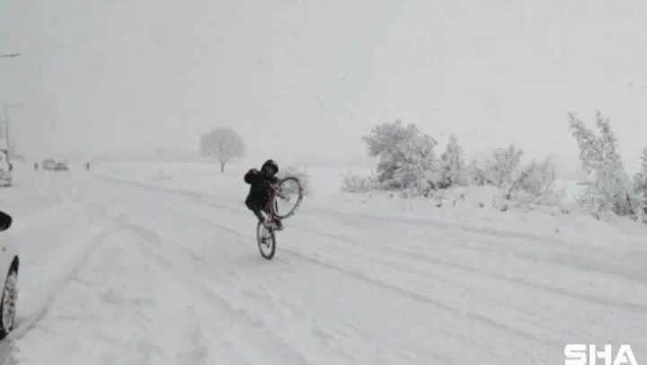 Bursa'da etkili olan kar yağışı sonrasında, kimi kar topu oynadı, kimi kardan adam yaptı, kimi ise herkesten farkı olduğunu gösterdi. Bisikletiyle kardan dolayı kapalı olan yola çıkan genç, kar üzerinde bisiklete binmenin keyfini çıkardı. Bisikletin önünü de kaldıran genç, yaptığı gösteriyle herkesin yüreğini ağzına getirdi.