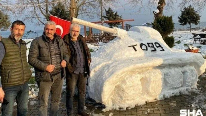 İznik gölü kıyısında bulunan Çınar Aile Çay Bahçesi işletmecisi Mehmet Udun ve yeğeni Serdar Udun ile çalışanları, kardan tank yaptı. Çalışanlar, tam 6 saatlik bir çalışma ile kardan dev bir tank yaptı.