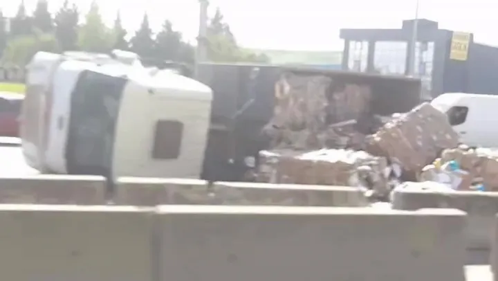 Kocaeli'nin Dilovası ilçesinde seyir halinde olan karton yüklü tır devrildi. Kazada sürücü yaralanırken yolda uzun araç kuyrukları oluştu.