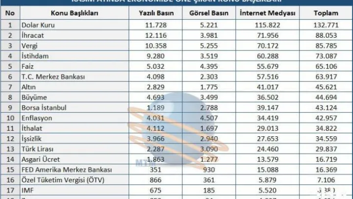 MTM, yaptığı araştırmada geçtiğimiz ayın ekonomi başlıklarını belirledi. Rapora göre, ekonomi dünyasında Bakanlık ve Merkez Bankası düzeylerinde yaşanan görev değişiklikleri, Kasım ayına damgasını vurdu. En çok dolar konusu gündemde kalırken, vergi yapılandırması da medyada sıklıkla yer alan ekonomik konuların başında geldi.