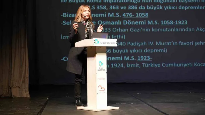 Fatma Kaplan Hürriyet'in konuşmasının ardından kürsüye çıkan Prof. Dr. Tuna Şare Ağtürk, İzmit'in antik tarihi hakkında önemli bilgiler verdi. İzmit'in çağlar boyu önemli bir kent olduğunu ifade eden Ağtürk, 'İnanılmaz stratejik bir konumu var. Özellikle Limanı çok önemli. Çağlar boyu önemli bir kent merkezi olarak önemini koruyor. Antik kaynaklara baktığımızda ilk bahsi geçen yerleşim 'Astakoz'. Başiskele'de, Körfez'in güney kısmında. M.Ö. 712 yılında Yunanistan'dan gelen Megaralar koloni kurmuşlar. İlk kayıt burada başlıyor. Sonrasında Helenistik dönem kralı Nikomedes, Nikomedia'yı kuruyor. Nikomedia, Helenistik krallığının başkenti oluyor. Sonrasında Roma İmparatorluğu büyüdükçe helenistik krallığını tek tek aşmaya başlıyor. Bitinya bölgesi de Roma İmparatolupunun parçası haline geliyor. Bu kez de Bitinya eyaletinin başkenti oluyor Nikomedia. Asıl önemi sonrasında başlıyor, Roma İmparatorluğunun parçası olduğu dönemde' diye konuştu.