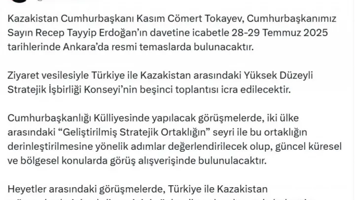 Duran, sosyal medya hesabından yaptığı paylaşımda Kazakistan Cumhurbaşkanı Kasım Cömert Tokayev'in Türkiye'ye geleceğini duyurdu. Duran paylaşımında, 'Kazakistan Cumhurbaşkanı Kasım Cömert Tokayev, Cumhurbaşkanımız Sayın Recep Tayyip Erdoğan'ın davetine icabetle 28-29 Temmuz 2025 tarihlerinde Ankara'da resmi temaslarda bulunacaktır. Ziyaret vesilesiyle Türkiye ile Kazakistan arasındaki Yüksek Düzeyli Stratejik İşbirliği Konseyi'nin beşinci toplantısı icra edilecektir' dedi.