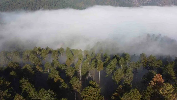 Sabah saatlerinde bölgeye meteoroloji yağış uyarısı verirken Kazdağları'nda orman alanlarının üzerine çöken bulutlar adeta ormanı yuttu. Ormanlık alanlar bulutların altında kayboldu. Bu doğa olayı ile birlikte Kazdağları'nda adeta bir bulut denizi oluştu. Meydana gelen bu doğal olayı İhlas Haber Ajansı dronu tarafından görüntülendi.