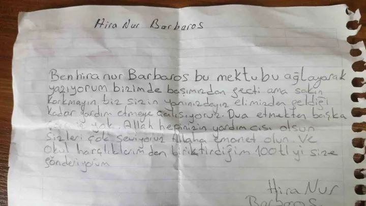 7 yaşındaki Hira Nur Barbaros, bağışladığı para ile birlikte yazdığı mektupla da duygulandırdı. Küçük kız mektubunda, 'Ben Hira Nur Barbaros. Bu mektubu ağlayarak yazıyorum. Bizim de başımızdan geçti ama sakın korkmayın, biz sizin yanınızdayız. Elimizden geldiği kadar yardım etmeye çalışıyoruz. Dua etmekten başka çaremiz yok. Allah hepinizin yardımcısı olsun. Sizleri çok seviyoruz. Allah'a emanet olun ve okul harçlıklarımdan biriktirdiğim 100 TL'yi size gönderiyorum' ifadelerini kullandı.