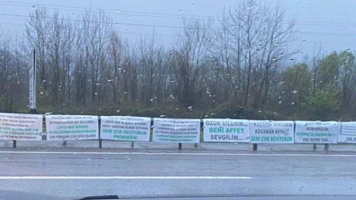 Kocaeli'de kendisini eşine affettirmek isteyen bir vatandaş inanılmaz bir yönteme başvurdu. Kartepe ilçesindeki bir yol kenarını pankartlarla dolduran vatandaş, her bir pankarttaki yazıda eşini çok sevdiğini, hata yaptığını ve af beklediğini yazdı.