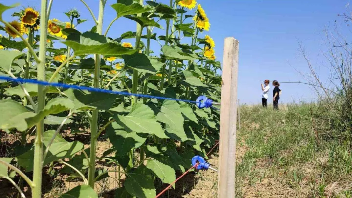Edirne'nin Keşan ilçesinde ayçiçeği eken çiftçiler, domuzların ürünlerine zarar vermemesi için çeşitli yöntemlere başvururken, genellikle domuz teli olarak adlandırdıkları sistemi kurduklarını söyle.