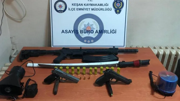 Alınan bilgiye göre; Yenimescit Mahallesi'nde meydana gelen olayda, bir kıraathaneye silahlı saldırı düzenlendi. Olayla ilgili geniş çaplı araştırma yapan Keşan İlçe Emniyet Müdürlüğü ve Özel Harekat Şube Müdürlüğü ekipleri ile birlikte tespit ettikleri 10 şüphelinin adresine eş zamanlı operasyon yaptı. Cumhuriyet Savcılığından alınan kararla adreslerde yapılan aramalarda; 1 adet ruhsatsız tabanca, 1 adet kuru sıkı tabanca, 1 adet av tüfeği, 12 adet av tüfeği kartuşu, 3 adet 7,65 mm tabanca fişeği, 1 adet tepe lambası, 1 adet siren, 1 adet kılıç, 9 adet kuru sıkı tabanca fişeği ele geçirildi. Polis, olayla ilgili S.K, U.K, A.G, Ş.K, A.C.K, A.Ö, A.A, H.İ, R.K ve O.G'yi yakaladı. Gözaltına alınan şüphelilerin emniyetteki işlemleri devam ediyor.