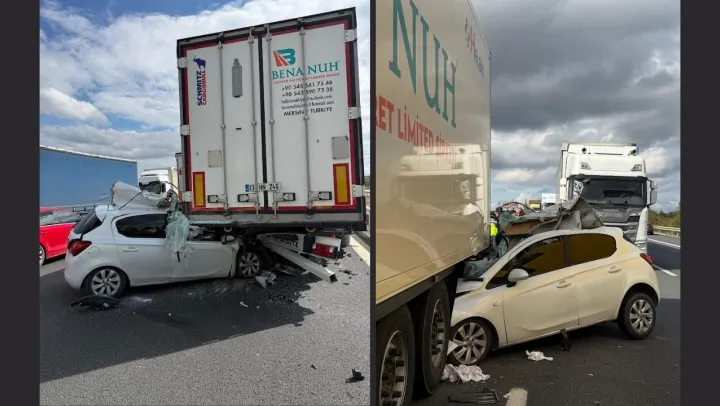 Kınalı Gişeleri Çerkezköy istikameti yönünde saat 13.40 sıralarında meydana gelen trafik kazasında, bir özel otomobil, önünde seyreden tırın dorsesine arkadan çarptı