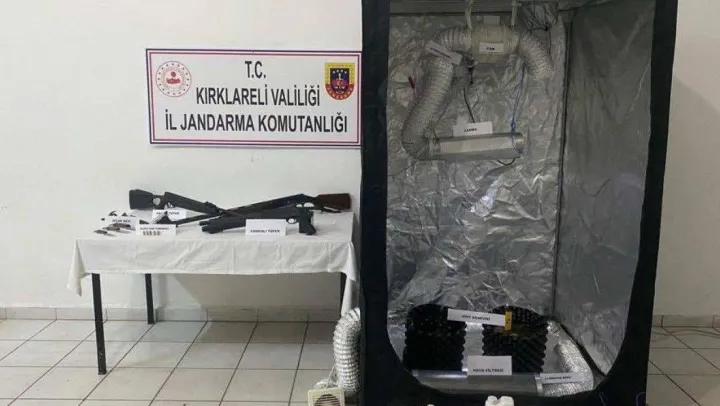 Şüphelilerin evlerinde yapılan aramada iklimlendirme sistemi, 2 kök kenevir, 3 hava filtresi, aspiratör, iç mekan çadırı, pompalı tüfek, av tüfeği, kurusıkı tabanca ile 3 bıçak ele geçirildi.