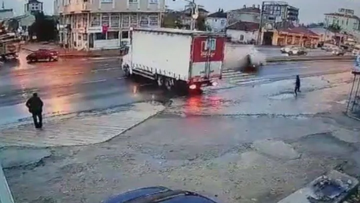 Tekirdağ'da kırmızı ışık ihlali yaptığı iddia edilen otomobilin, yola çıkan kamyondan kaçarken refüje çarparak takla attığı kaza kameraya yansıdı. Kaza sonucu otomobildeki sürücü ve yolcu yaralandı.
