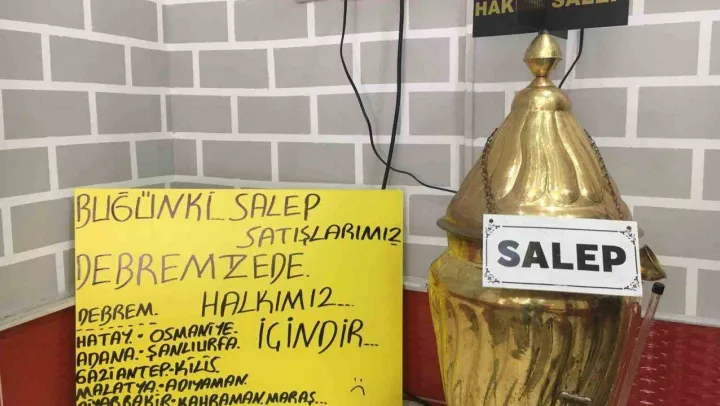 Kastamonu şehir merkezinde salep üretimi yapan 31 yaşındaki Fatih Cin'in iş yerinin camına astığı 'Tüm gelirini depremzedelere bağışlayacağız' yazısı rağbet görüyor. Yazıyı gören vatandaşlar, kış günü hem salep içiyor hem de geliri deprem bölgesine bağışlanacak yardım kampanyasına destek veriyor.