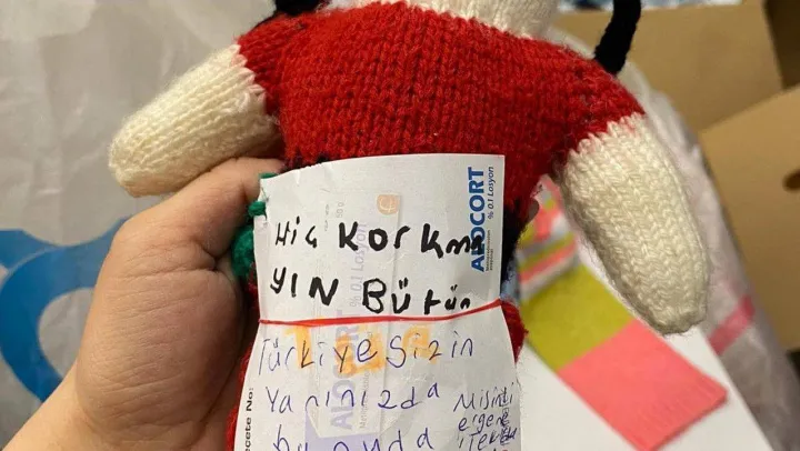 'Hiç korkmayın, bütün Türkiye sizin yanınızda, bunu da atlatacağız', 'Merak etmeyin bugünler de geçecek' ve 'Hasan Ertuğrul'un kumbarası, kardeşlerine hediyesi' şeklinde notlar ile depremzedelere gönderilmek üzere teslim edilen oyuncaklar, duygusal anların yaşanmasına neden oldu.