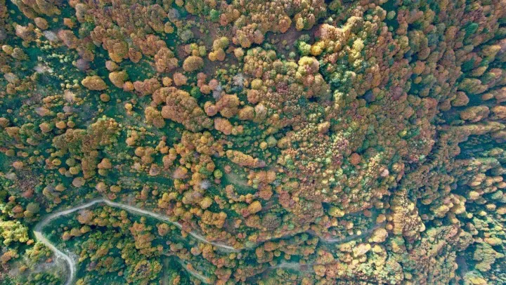 Kocaeli'de sonbaharla birlikte farklı tonlara bürünen ağaçlar görsel şölen sunuyor. Ormanlarda oluşan kartpostallık görüntüler havadan da görüntülendi.