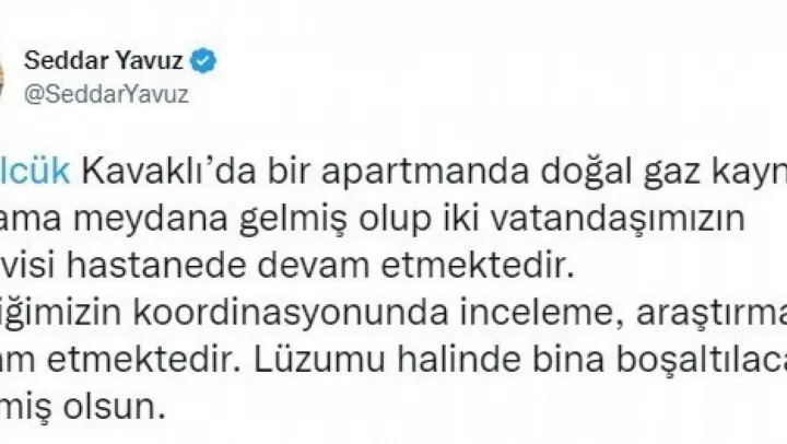 Kocaeli Valisi Seddar Yavuz, Gölcük'te meydana gelen patlamaya ilişkin yaptığı açıklamada, 'Doğal gaz kaynaklı patlama meydana gelmiş olup, iki vatandaşımızın tedavisi hastanede devam etmektedir. Valiliğimizin koordinasyonunda inceleme, araştırma devam etmektedir. Lüzumu halinde bina boşaltılacaktır' dedi.