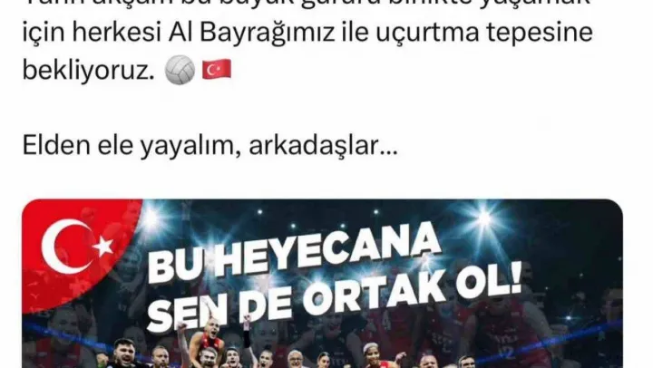 Kocaeli Büyükşehir Belediye Başkanı Tahir Büyükakın, sosyal medya hesabından yaptığı paylaşımda, 'Filenin Sultanlarının final heyecanı için dev ekran kuruyoruz. Yarın akşam bu büyük gururu yaşamak için herkesi al bayrağımız ile Uçurtma Tepesi'ne bekliyoruz' dedi.