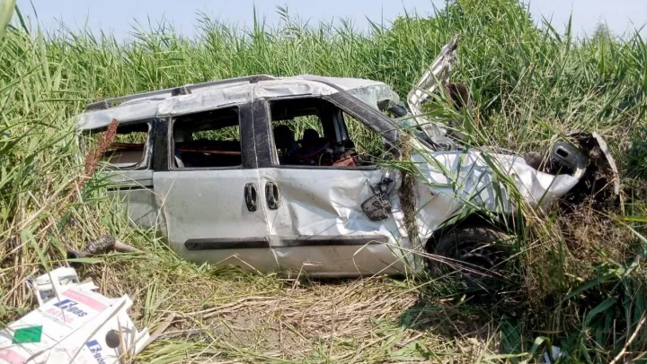 Mustafakemalpaşa'da köpeğe çarpan araç, bariyerlere uçtu. Kazada 2 kişi yaralandı.