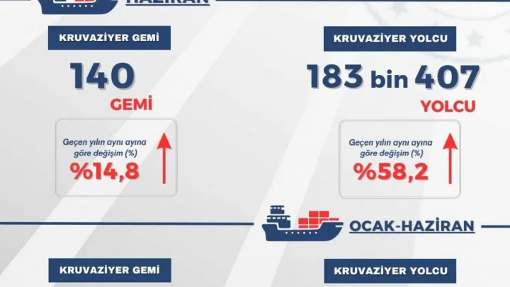 'Dünyada yaşanan bazı olumsuzluklar nedeniyle turizm sektörü sıkıntılı günler yaşadı. Ancak ülkemiz turizmde bu olumsuzluklara rağmen talep gören ülke oldu. Bunun da en büyük göstergesi giderek artan kruvaziyer turizmi. Limanlarımıza gelen kruvaziyer gemi ve yolcu sayıları geçen yıla oranla adeta rekor kırdı. 2023 yılı Haziran ayında limanlarımıza uğrak yapan kruvaziyer gemi sayısı geçen yılın aynı ayına göre yüzde 14,8 artışla 140 adet oldu. Haziran ayında limanlarımıza gelen kruvaziyer yolcu sayısı ise geçen yılın aynı ayına göre yüzde 58,2 artışla 183 bin 407 yolcu oldu. 2023 yılı Ocak-Haziran döneminde ise limanlarımıza uğrak yapan kruvaziyer gemi sayısı geçen yılın aynı dönemine göre yüzde 32,5 artışla 420 adet, limanlarımıza gelen kruvaziyer yolcu sayısı da geçen yılın aynı dönemine göre yüzde 88,8 artışla 482 bin 925 yolcu ziyaret etti.'