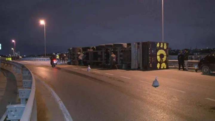 Kaza, 17.30 sıralarında Küçükçekmece'de İstasyon Caddesi mevkiinde bulunan üstgeçitte meydana geldi. Konteyner taşıyan 34 EKB 070 plakalı tır, üst geçitteki virajdan dönerken henüz bilinmeyen bir sebeple sürücüsü Tursun Müminoğlu'nun kontrolünden çıkarak devrildi. Kazada ölen ya da yaralanan olmazken, tır sürücüsü de burnu bile kanamadan araçtan çıktı. Belediye ekipleri, devrilen tırdan dökülen yağ ve mazot nedeniyle kayganlaşan yolda kumlama çalışması yaptı. Devrilen tır nedeniyle tek şeritten sağlanan trafik akışı, tırın vinç vasıtasıyla yoldan kaldırılmasının ardından normale döndü.