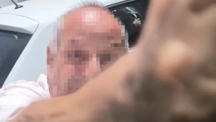 Görüntülerde otomobil sürücüsünün sinirli bir şekilde camı yumrukladığı ve bağırarak hakaretler ettiği anlar yer aldı.