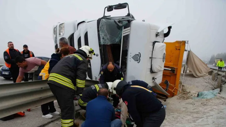 Kum yüklü tır devrildi: Sıkışan sürücü itfaiye tarafından kurtarıldı