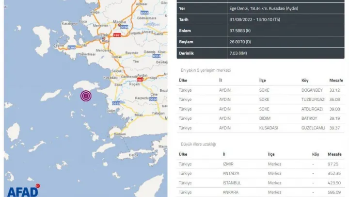 Aydın'ın Kuşadası ilçesi 4.7'lik depremin ardından, 15 dakika sonra 5.1 büyüklüğünde depremle yine sallandı. Afet ve Acil Durum Yönetim Başkanlığı (AFAD) Deprem Dairesi Başkanlığı tarafından yapılan açıklamaya göre, Kuşadası ilçesi açıklarında 5.1 büyüklüğünde deprem meydana geldi. Kuşadası'nın 18.34 kilometre açığında saat 13.10 sıralarında 7.03 kilometre derinlikte gerçekleşen deprem Aydın ve ilçelerinde hafif şekilde hissedildi.