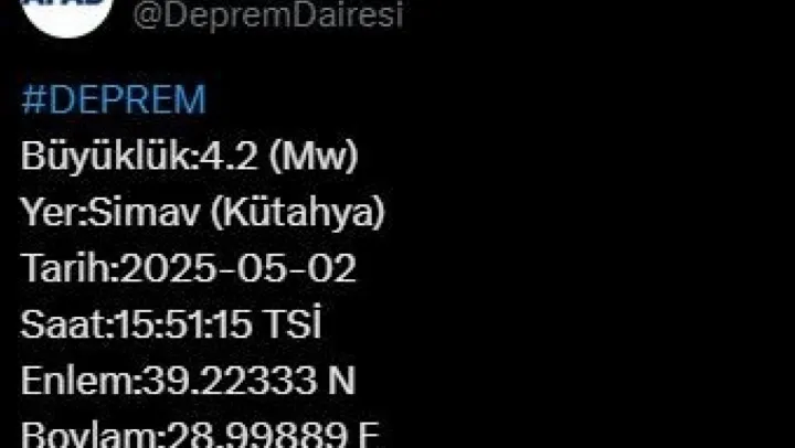 AFAD, Kütahya'nın Simav ilçesinde 4,2 büyüklüğünde deprem meydana geldiğini bildirdi.