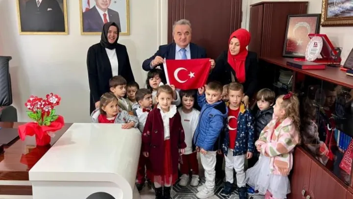 Bilecik'in Bozüyük ilçesinde, Halime Hatun Anaokulu öğrencileri tarafından yürütülen 'Kutsal Emanet' projesi kapsamında hazırlanan Bayrak Zinciri, Bozüyük Kaymakamı Adem Öztürk'e takdim edildi. Kaymakam Öztürk, öğrencilerle bir araya geldiği ziyarette, proje sürecinde emeği geçen idareci, öğretmen ve öğrencileri tebrik etti. Öztürk, milli ve manevi değerlere sahip çıkmanın önemine değinerek, 'Geleceğimizin teminatı çocuklarımızın bu tür anlamlı projelerde yer alması bizler için büyük gurur kaynağıdır. Milli değerlerimizi öğrenmeleri ve yaşatmaları için her zaman yanlarında olacağız' dedi.